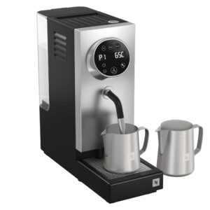 Mælkeskummer, Nespresso Professional Steamer Pro En mælkeskummer som sikrer en førsteklasses kaffeoplevelse. Den er fuldt kompatibel med plantebaserede mælkealternativer og har tre forudindstillede temperaturtilstande, der sikrer den perfekte kop hver gang. Den kræver ingen direkte vandtilslutning og har semi-automatisk rengøring for nem vedligeholdelse. Med en opvarmningstid på kun 30 sekunder og en forventet levetid på 12.000 cyklusser er den ideel til travle kontorer. Dertil har den automatisk sluk funktion. Steamer Pro er den perfekte løsning til at løfte kaffeoplevelsen. Den har en vandtank med kapacitet på 1,5 l, en ledning på 90 cm og vejer 5,6 kg. Den måler HxBxD 36,7 x 14 x 36,7 cm.